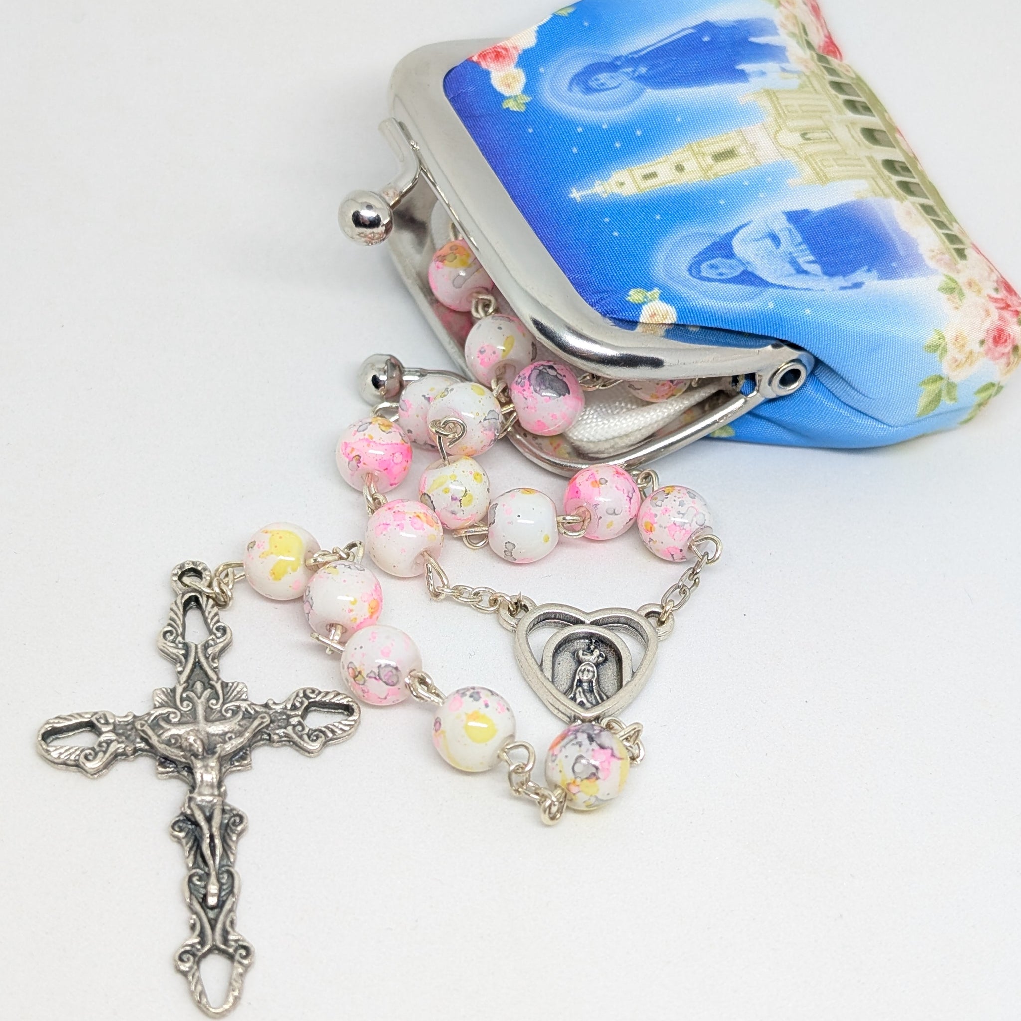 This beautiful and distinctive rosary features smooth, round crystal beads with a striking pink marble effect. The unique coloration makes it a vibrant and joyful piece for personal devotion or a special gift. It includes a classic, ornate Crucifix and a silver-toned heart centerpiece featuring a detailed Image of Our Lady of Fatima. The rosary comes complete with a charming, small Fatima Pouch printed with an image of Our Lady, providing a convenient and protected way to carry your spiritual aid.