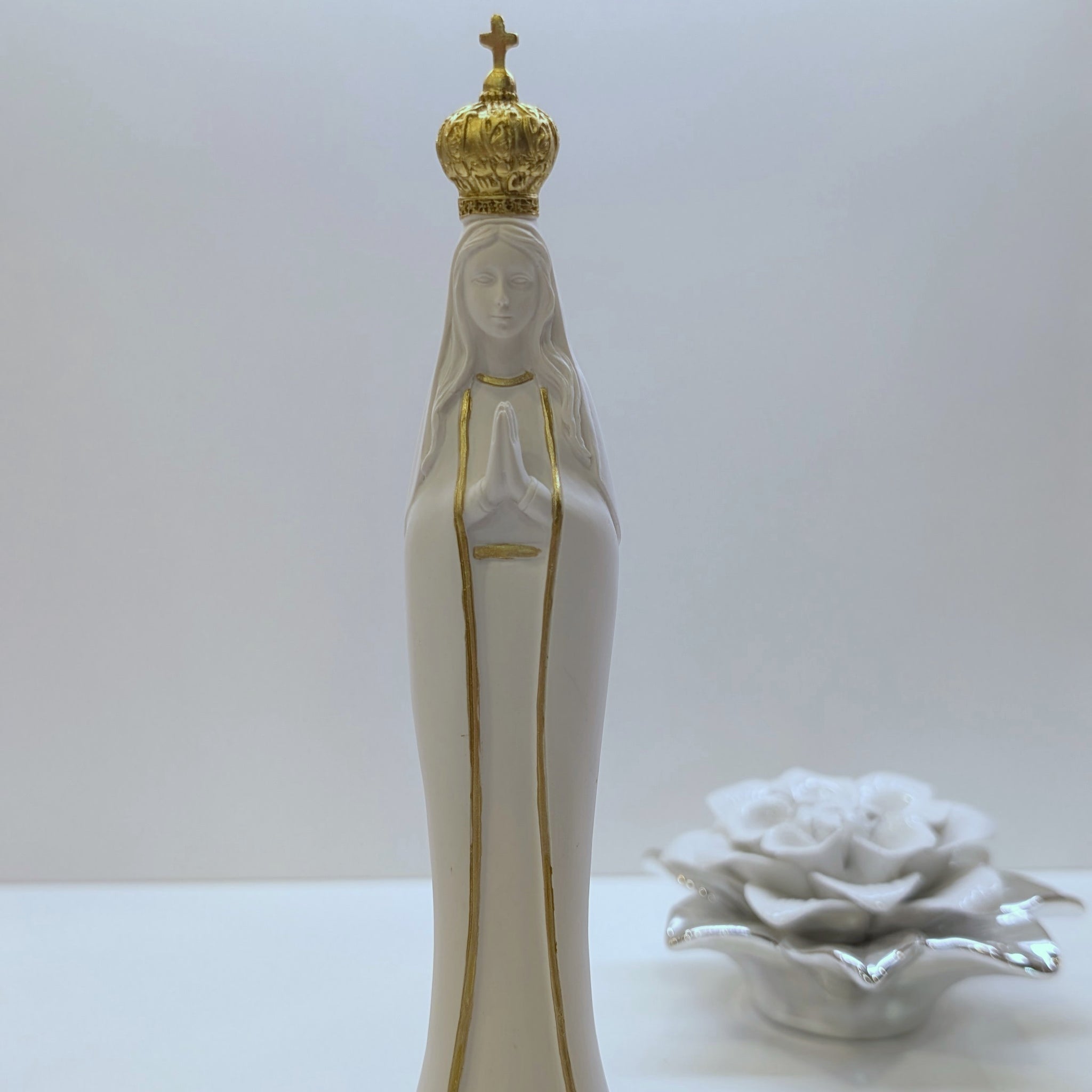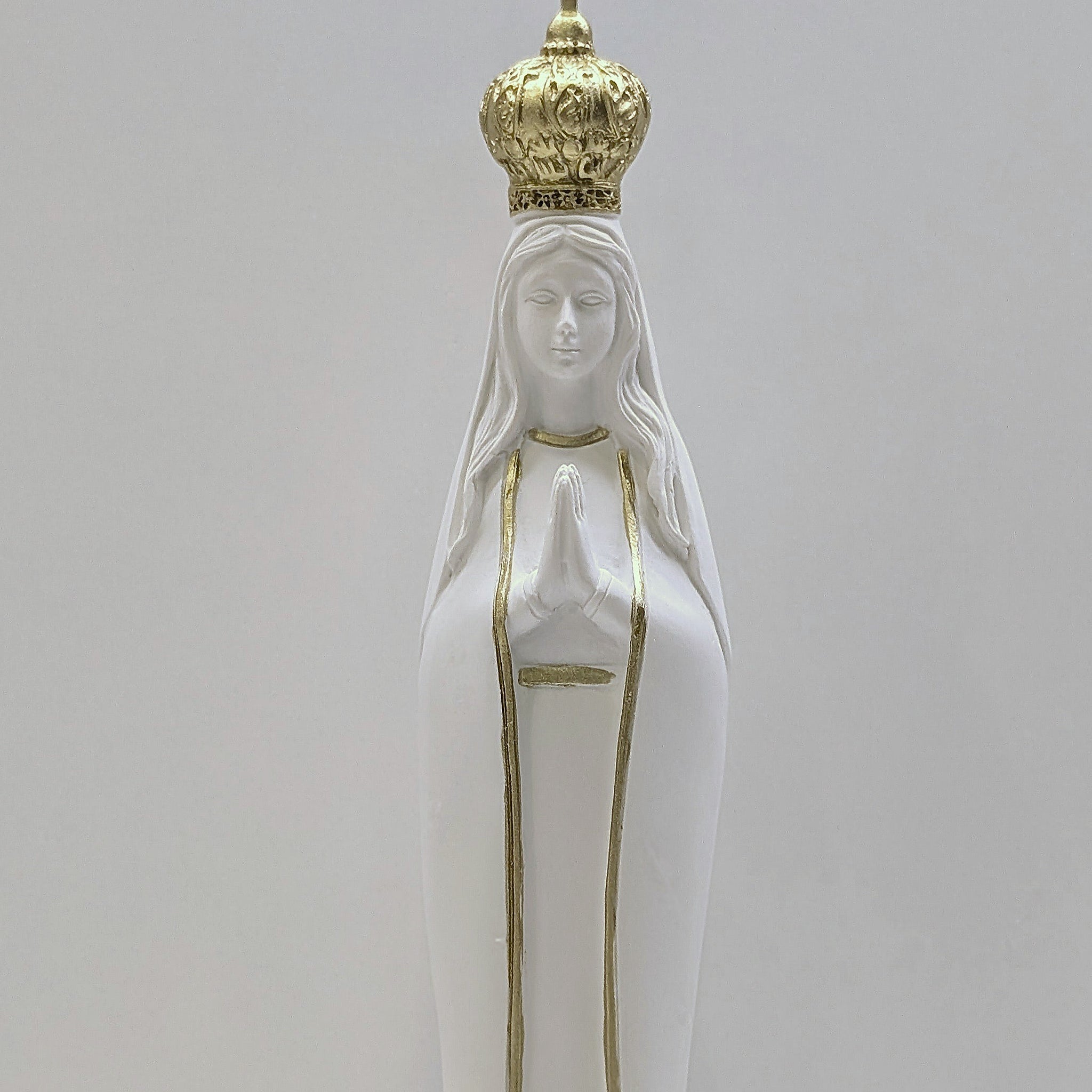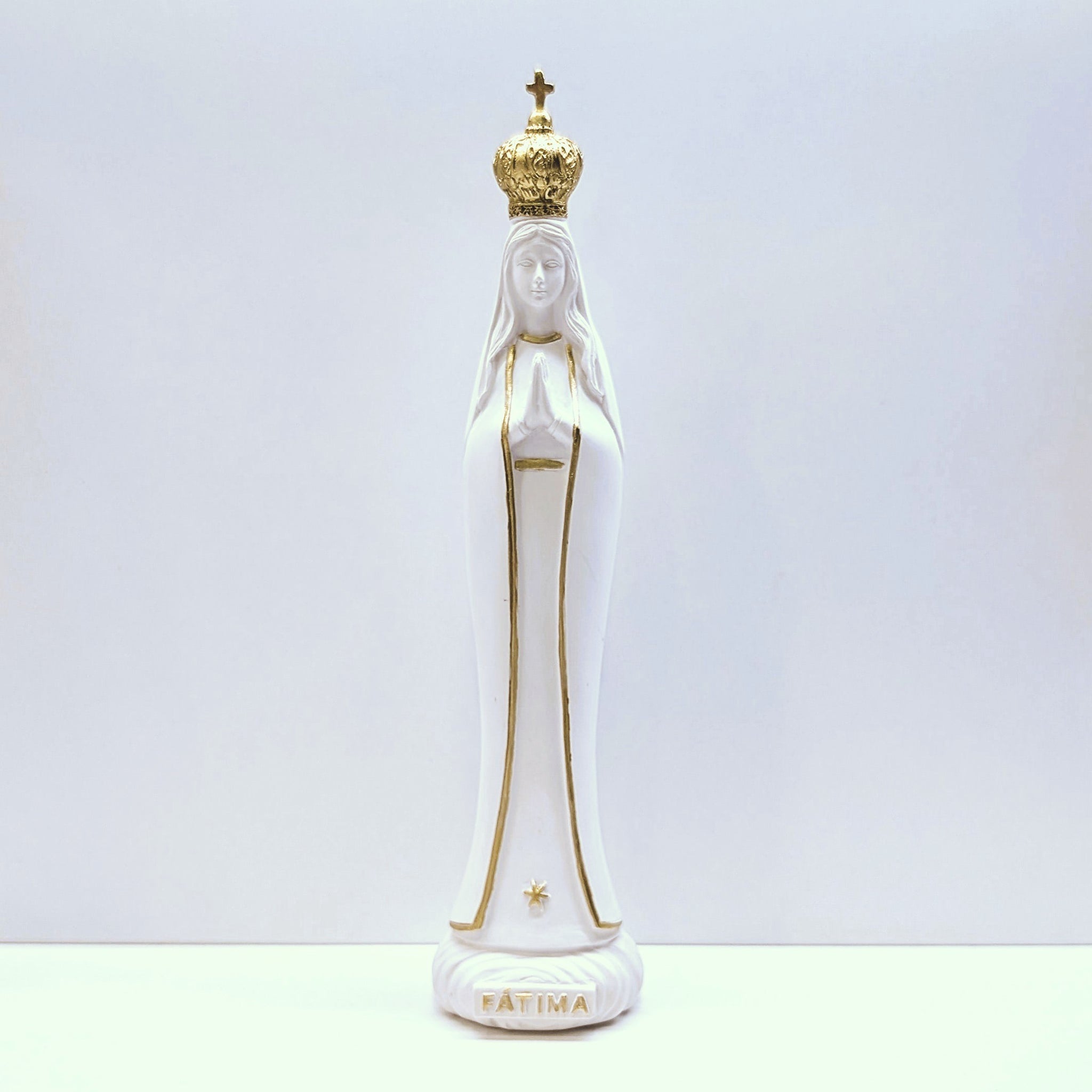 Esta Imagen de Nuestra Señora de Fátima presenta un acabado dorado deslumbrante, ideal para quienes buscan una pieza devocional que combine elegancia y espiritualidad. Con una altura de 20 cm (aproximadamente 7.9 pulgadas), esta pieza de resina destaca por sus trazos serenos y un estilo contemporáneo que encaja perfectamente en ambientes modernos. Aunque su acabado es actual, el molde respeta las líneas tradicionales de las esculturas clásicas del siglo XX, evocando la luz divina de las apariciones en la Cova da Iria. Es un regalo significativo o una pieza central perfecta para un altar personal.