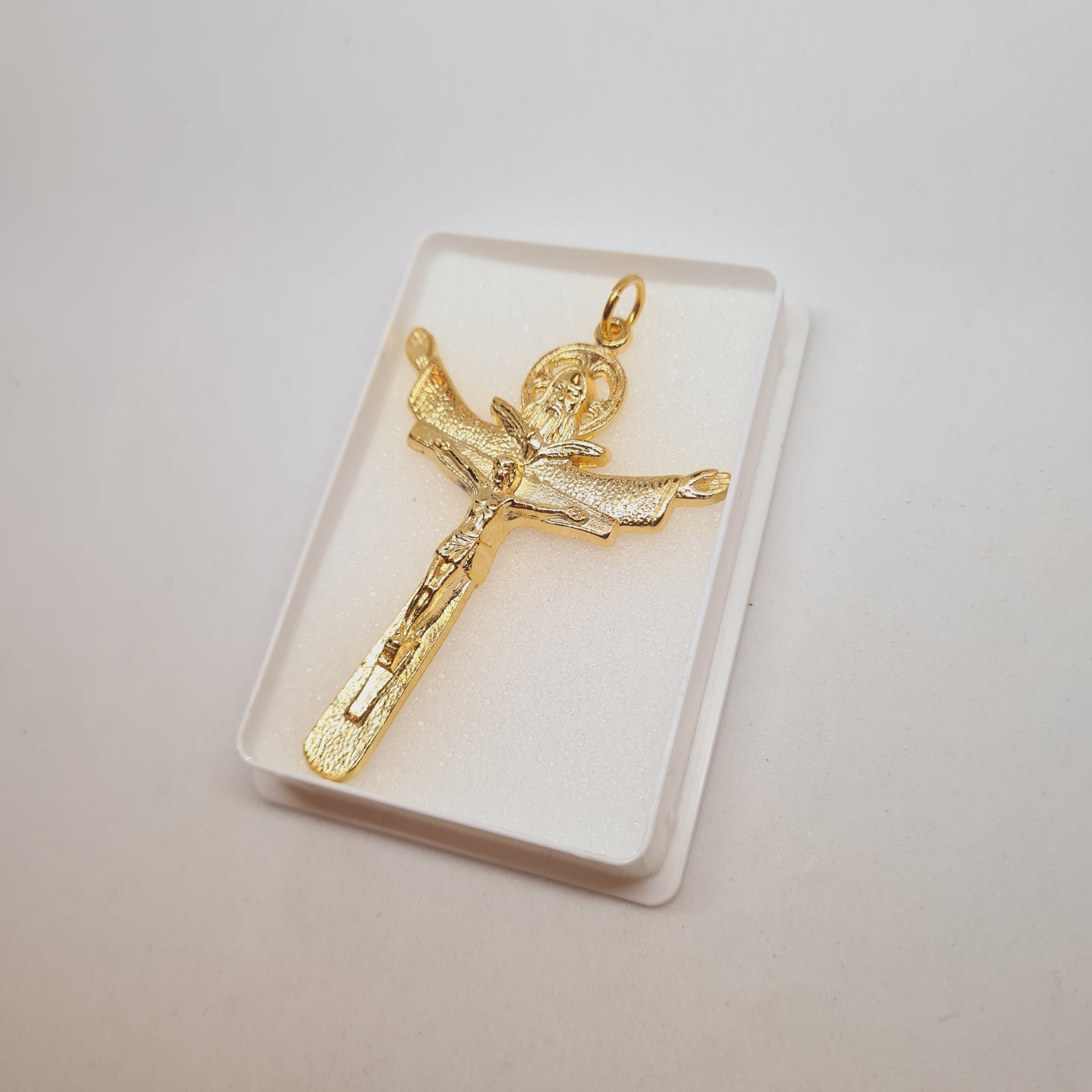 Elaborada con precisión y cuidado, la Cruz de la Santísima Trinidad es más que un simple símbolo cristiano: es una expresión sublime del mayor misterio de la fe: la unidad de Dios en tres Personas: Padre, Hijo y Espíritu Santo. Rica en simbolismo, invita a la profunda contemplación y a la alabanza de la perfección divina.
