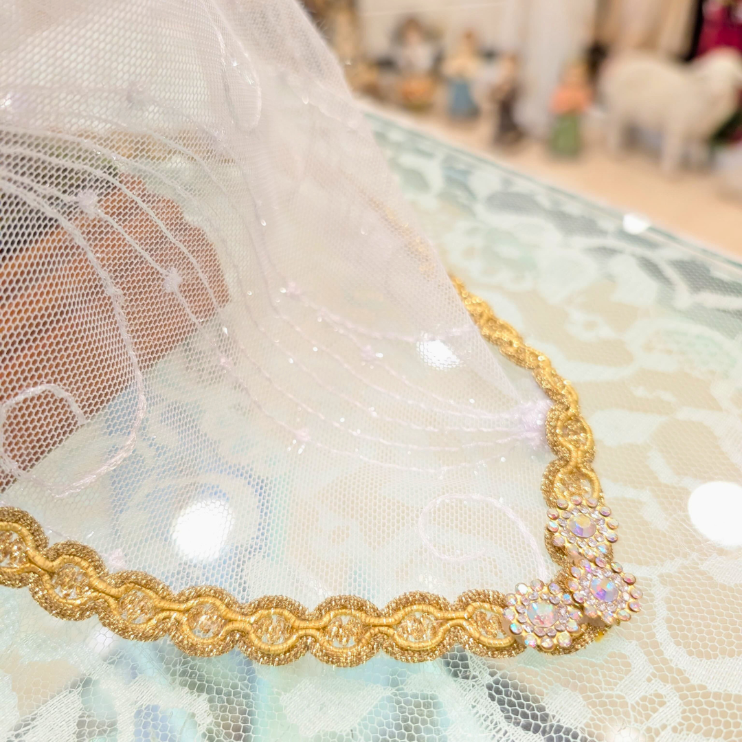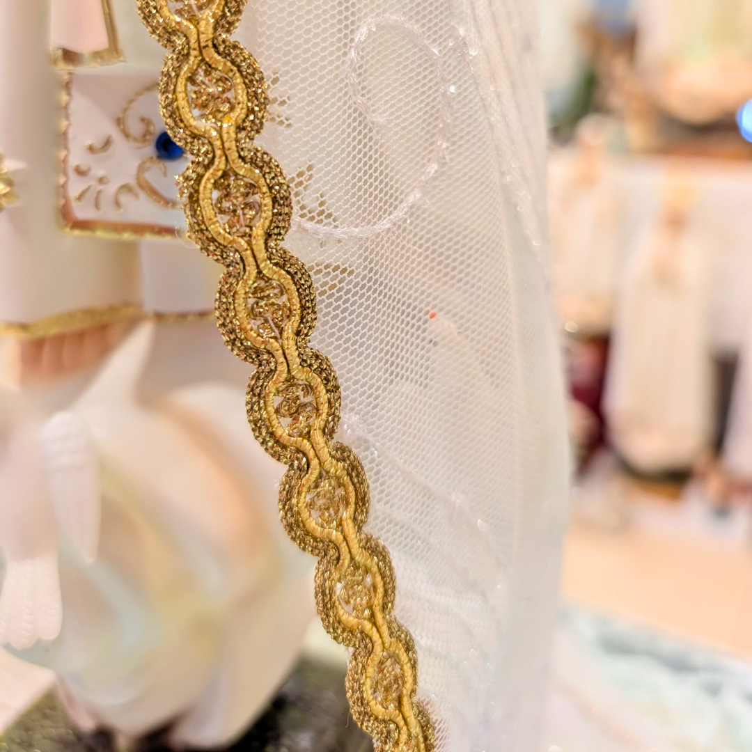 Presenting the Premium Bundle: Filigree Crown with Crystals & Statue White Veil. This exclusive set is meticulously designed to perfectly fit your 20-inch (50cm) Our Lady of Fatima statue. Includes a stunning, hand-sculpted filigree crown, intricately crafted with delicate golden threads and adorned with sparkling crystals, symbolizing majesty and divine grace. Accompanying it is a beautiful white veil, gracefully designed to drape over the statue, enhancing Her purity and ethereal presence.