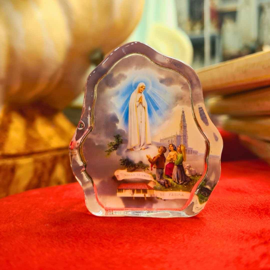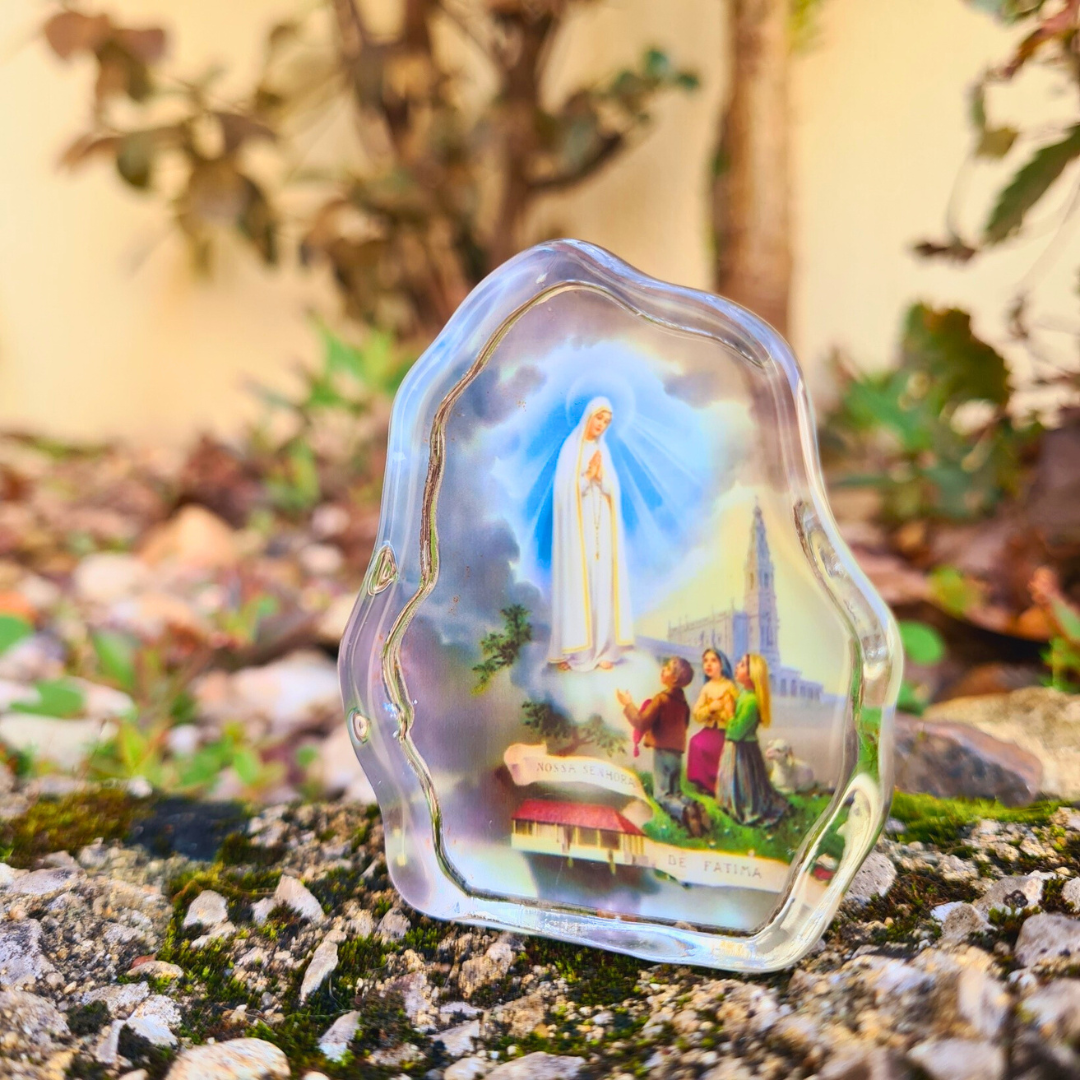 Experience the divine with the Crystal Fátima Grotto. This stunning piece depicts the apparition of Our Lady of Fatima to the Three Shepherd Children in a grotto-shaped crystal.
