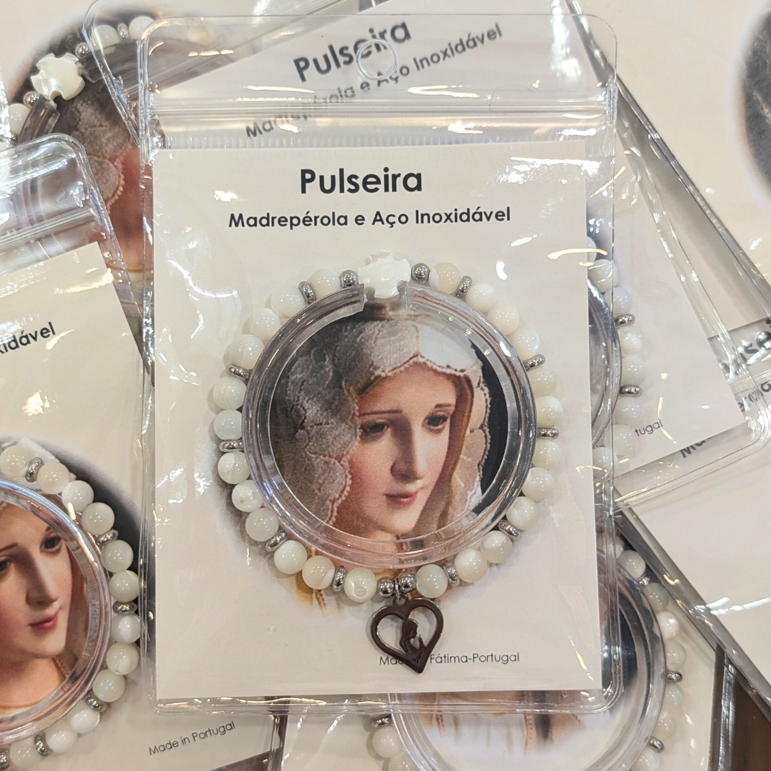Experience the elegance and serenity of our Mother of Pearl Bracelet featuring a heart of Our Lady of Fatima and a Cross.