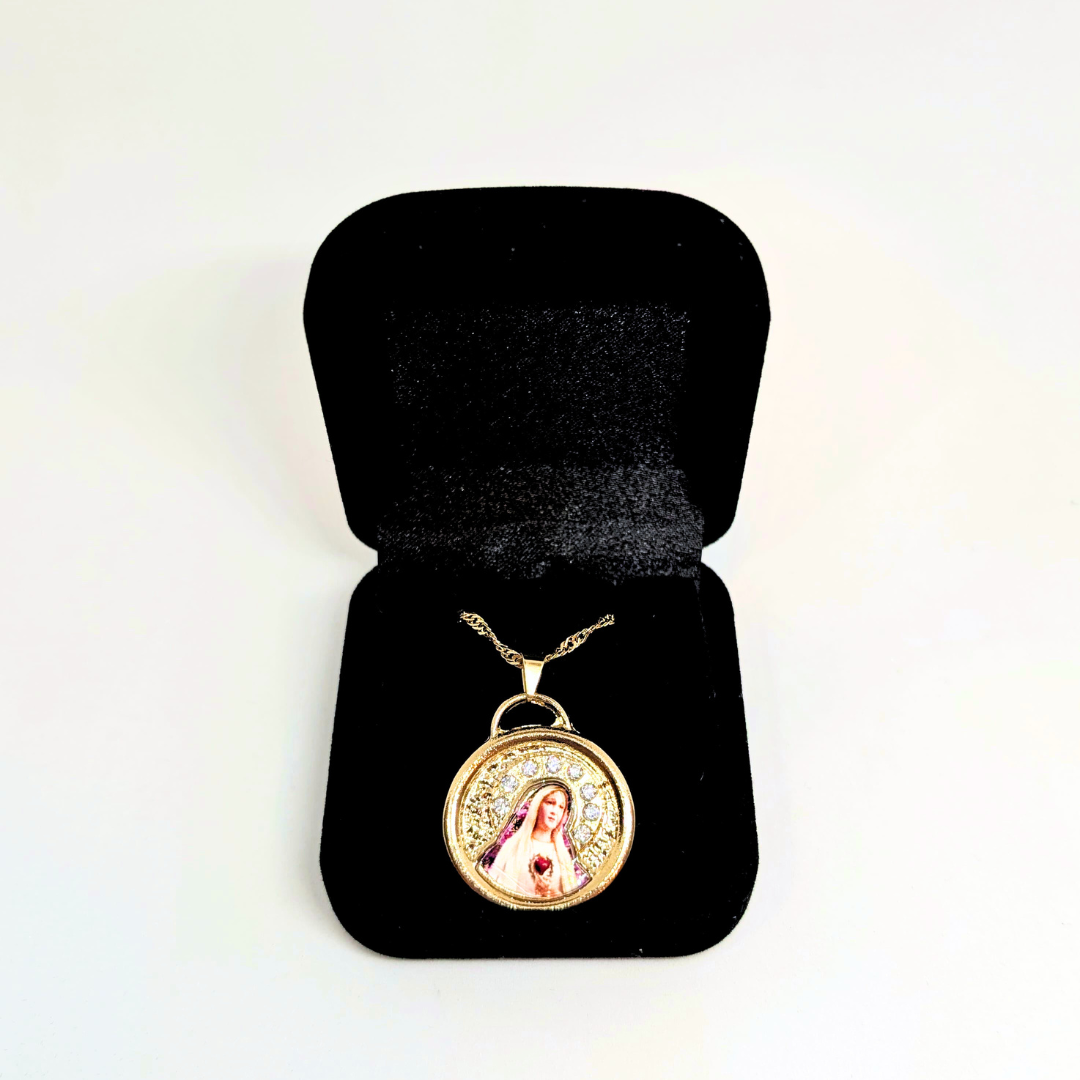 Available in gold or silver veneer, this necklace features a stunning image of Our Lady of Fatima prayerfully surrounded by 8 sparkling zirconias.
