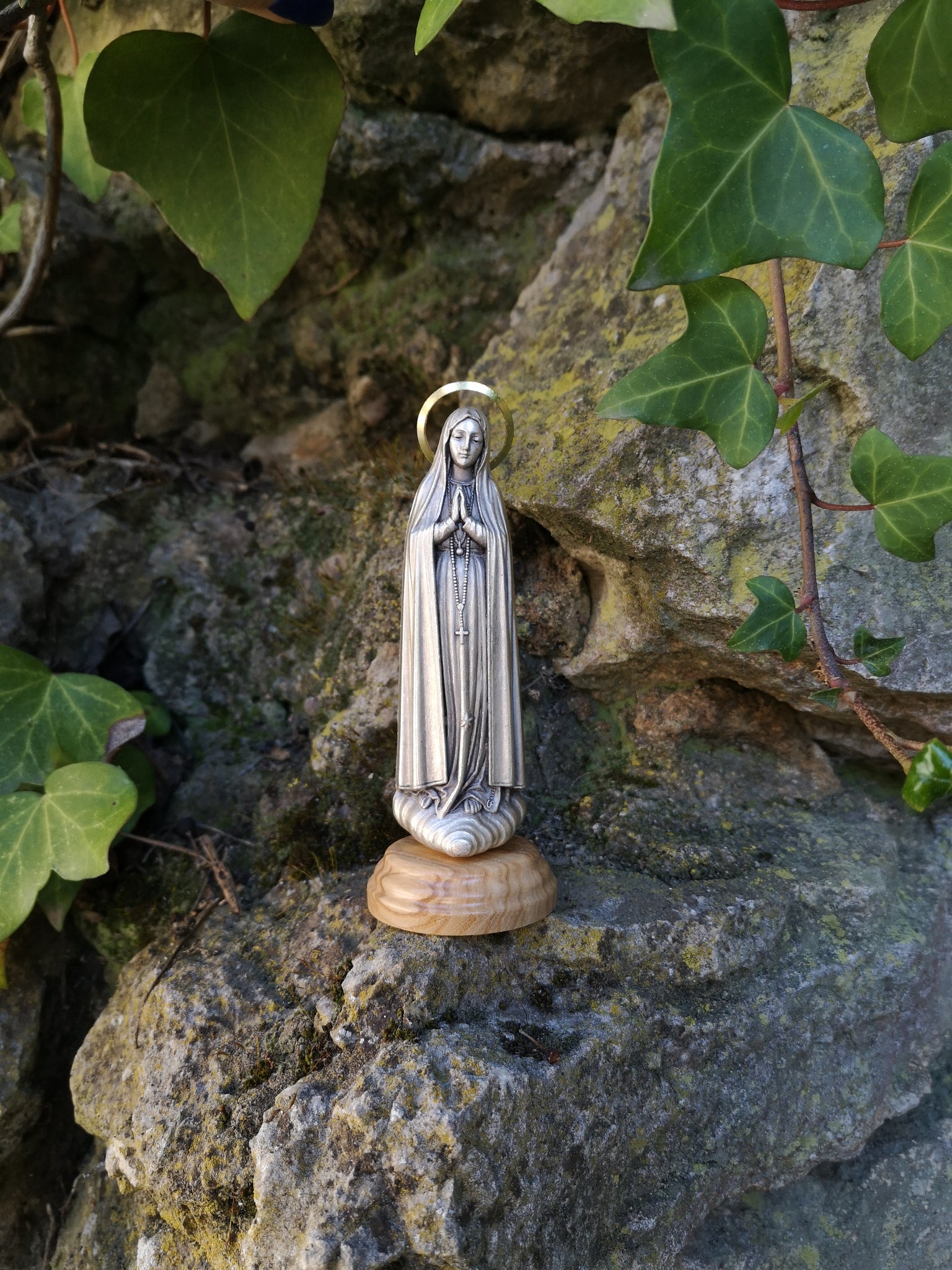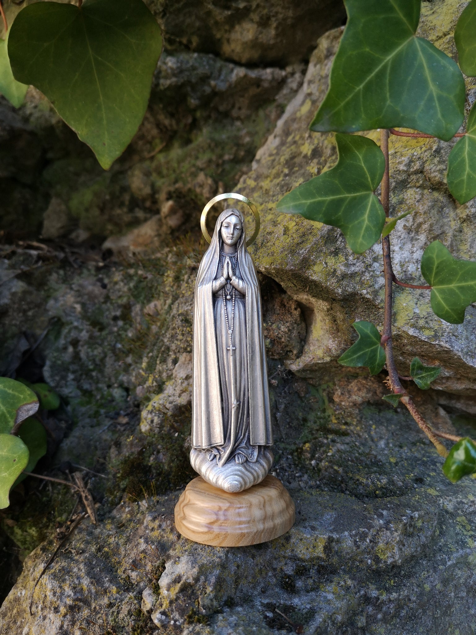 Introducing our stunning metallic Our Lady of Fatima statue, mounted on a beautifully crafted wood base. This exquisite statue measures 5 inches / 12.5 cm, making it the perfect size for displaying on a desk, in a car, or any other small space.