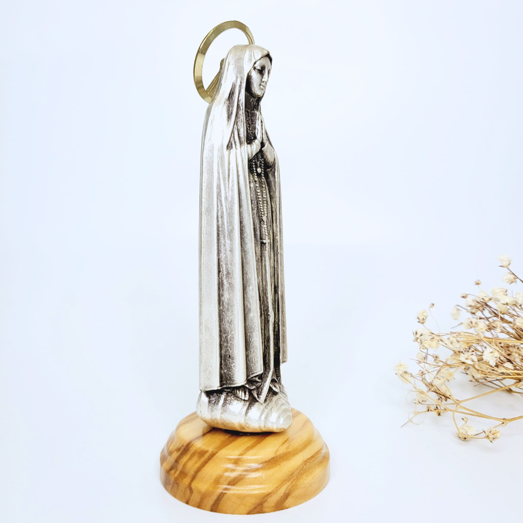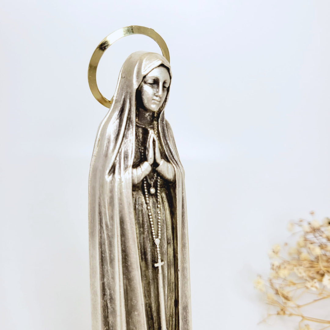 Crafted from high-quality metallic materials, the statue depicts Our Lady of Fatima in all her glory. The intricate details of her robes and features are beautifully rendered, capturing the essence of this beloved religious figure. Her hands are clasped in prayer, and her serene expression radiates peace and tranquility.
