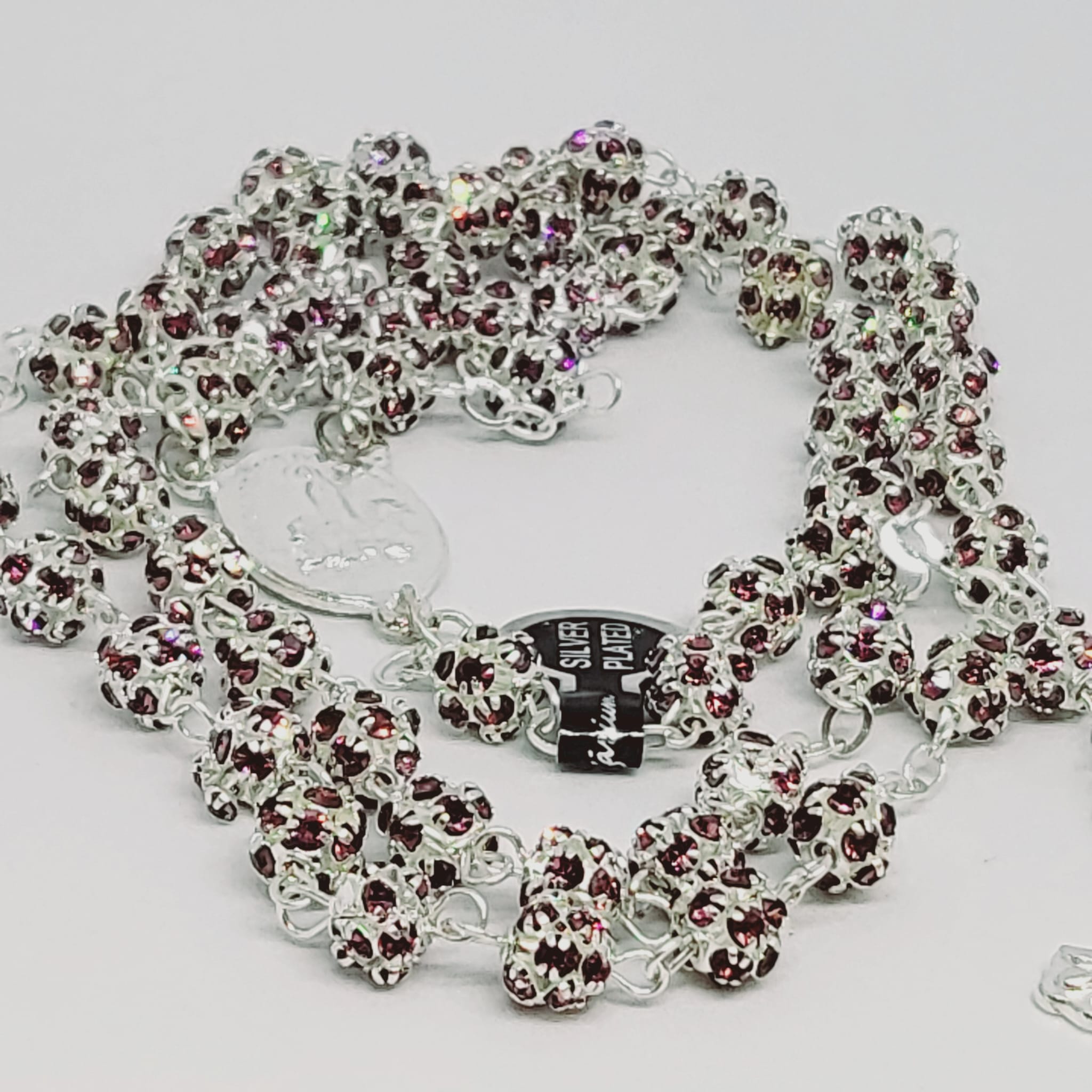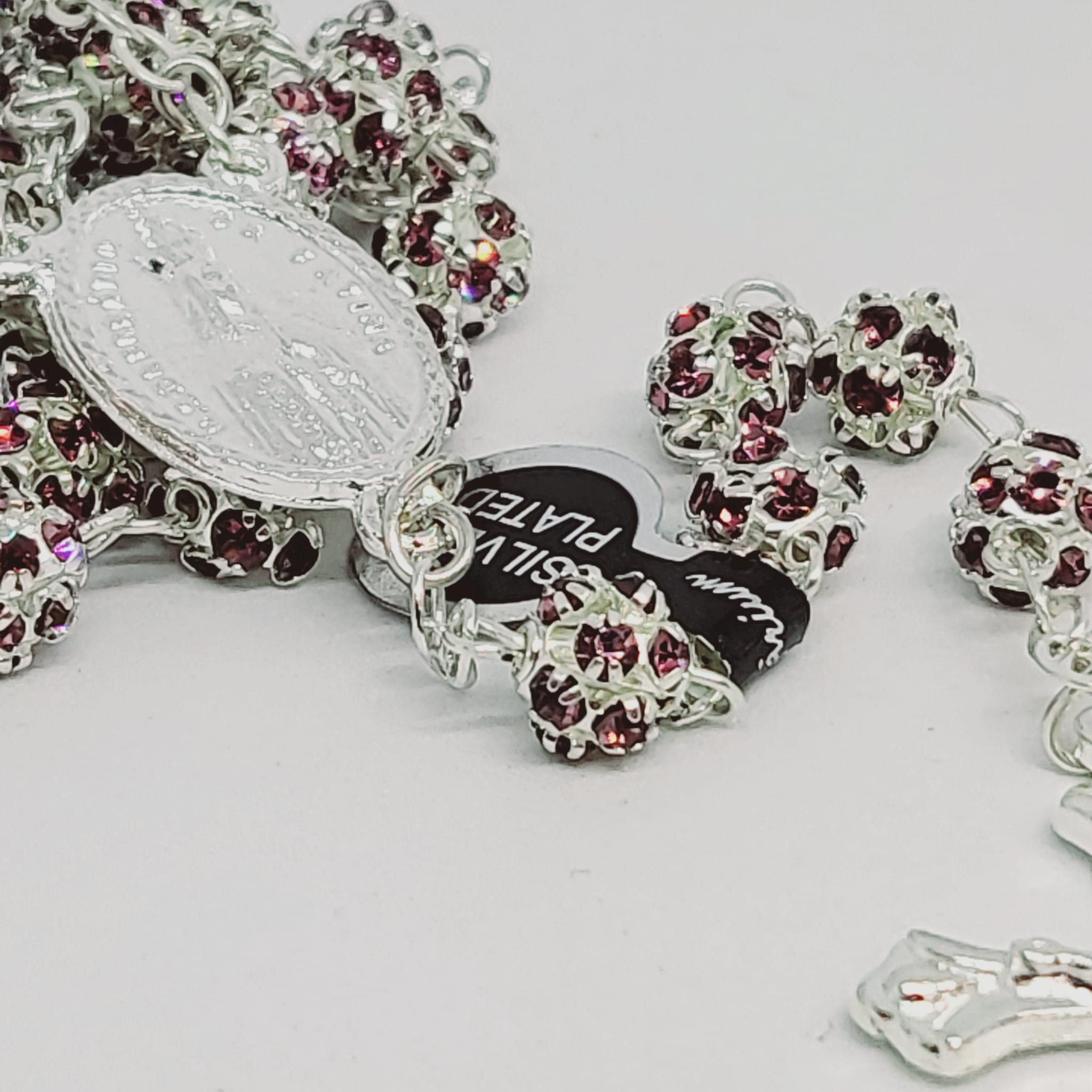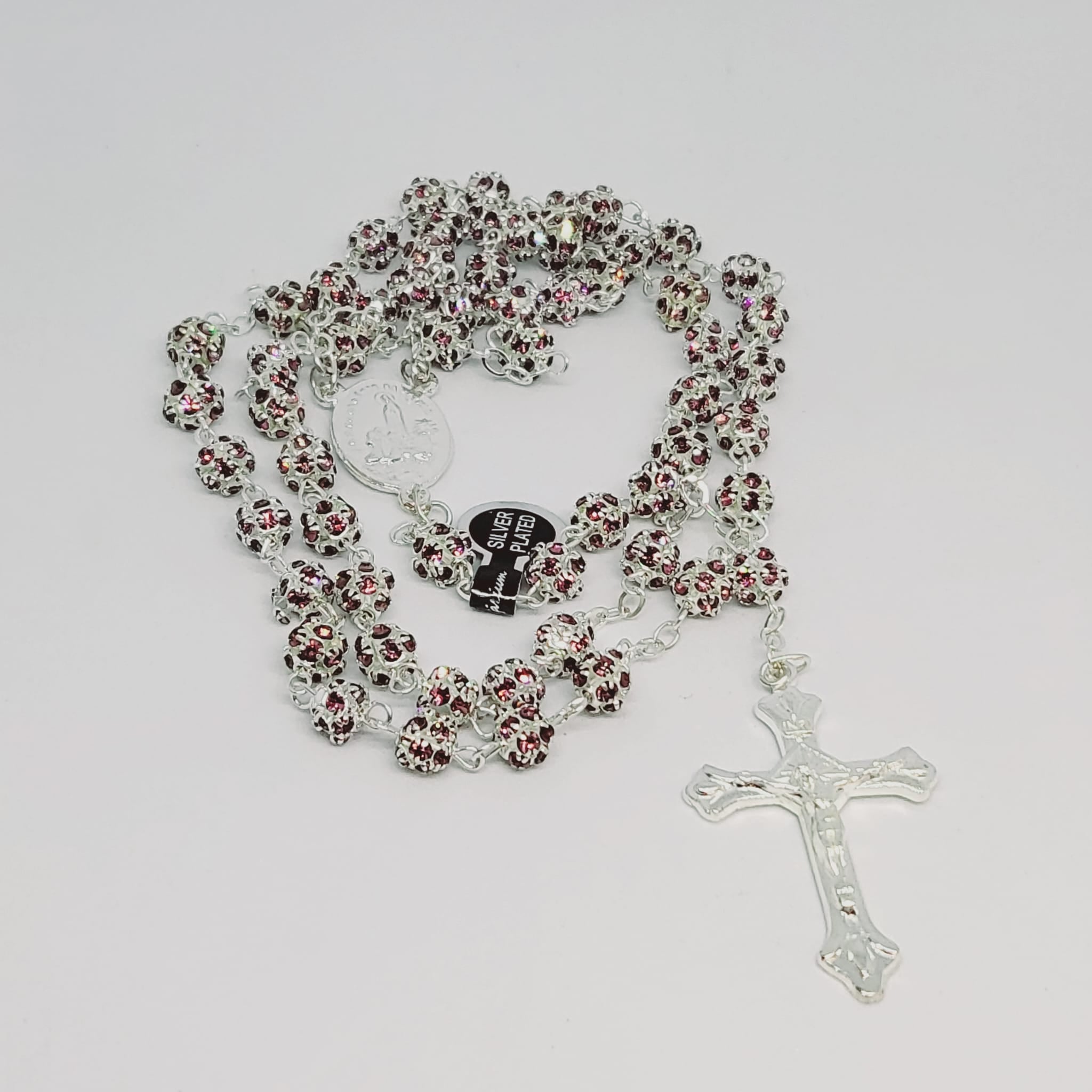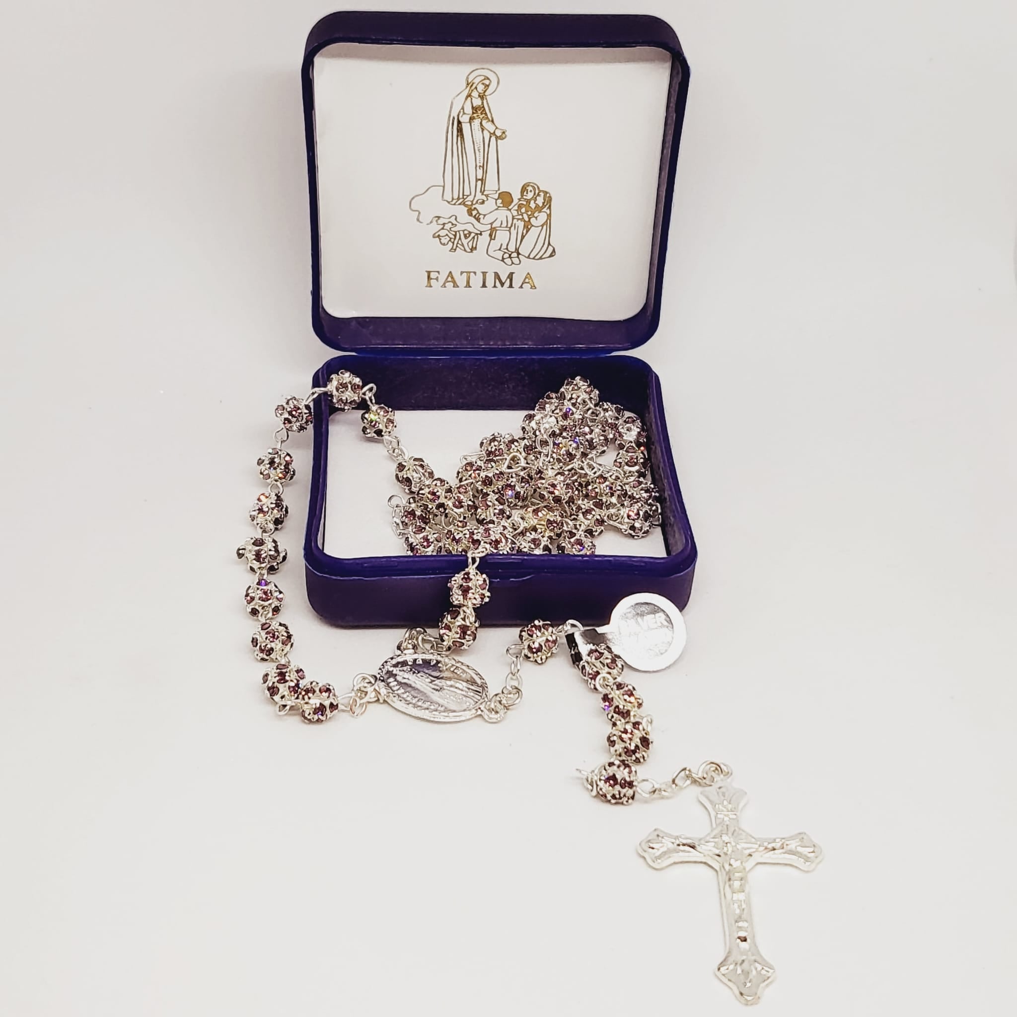 The double-layered beads are connected by a silver veneer cord all around and by a very special medal of Our Lady of Fatima as centerpiece.