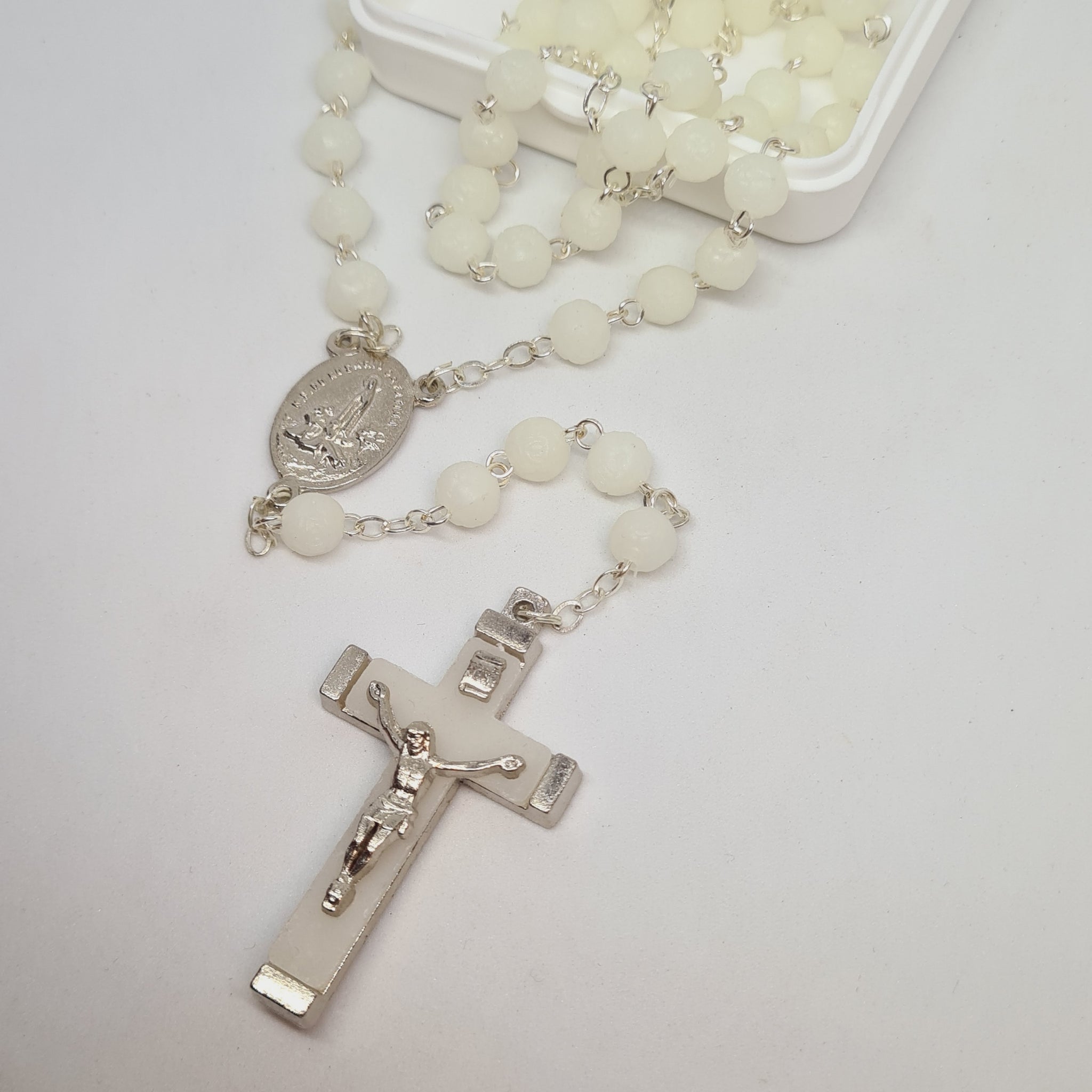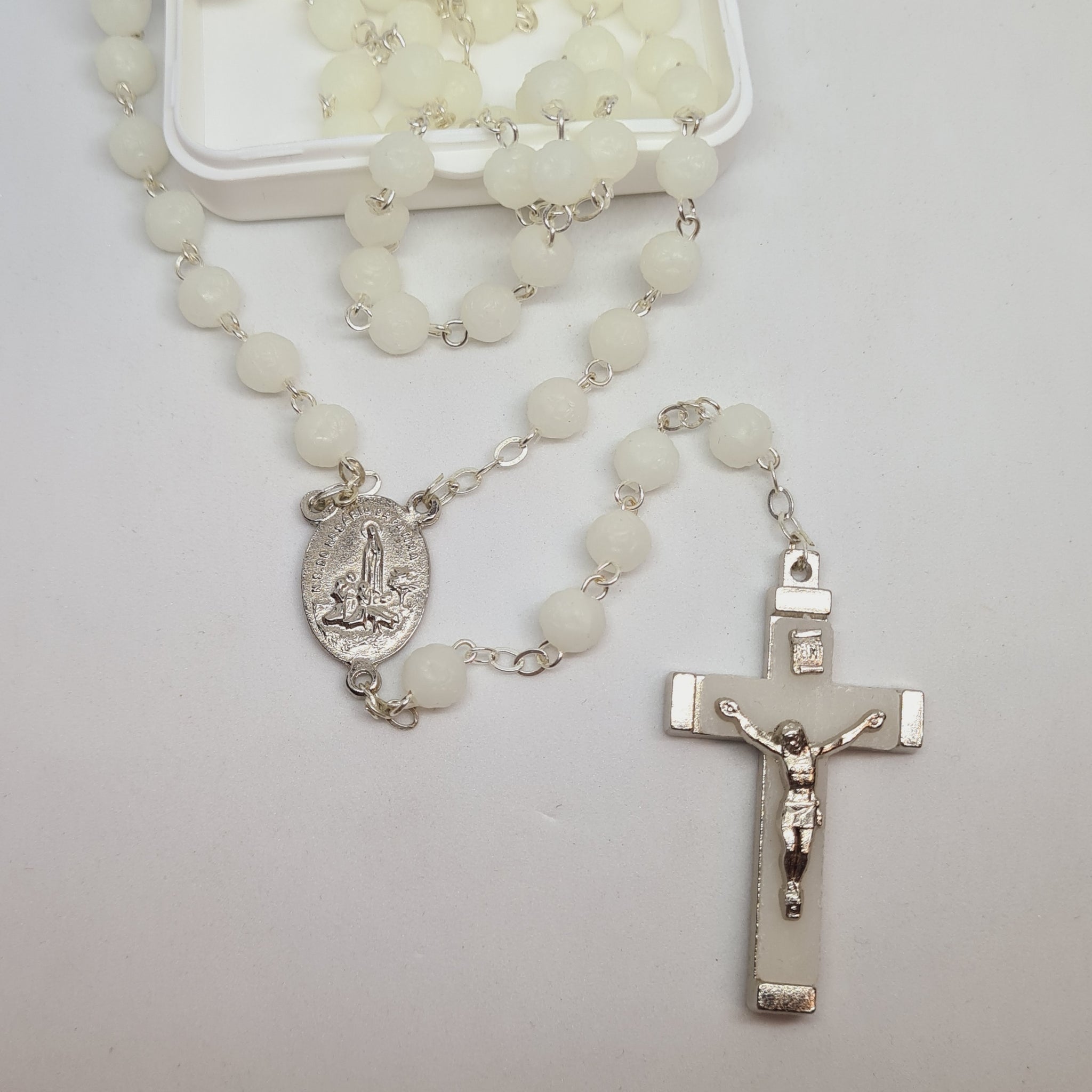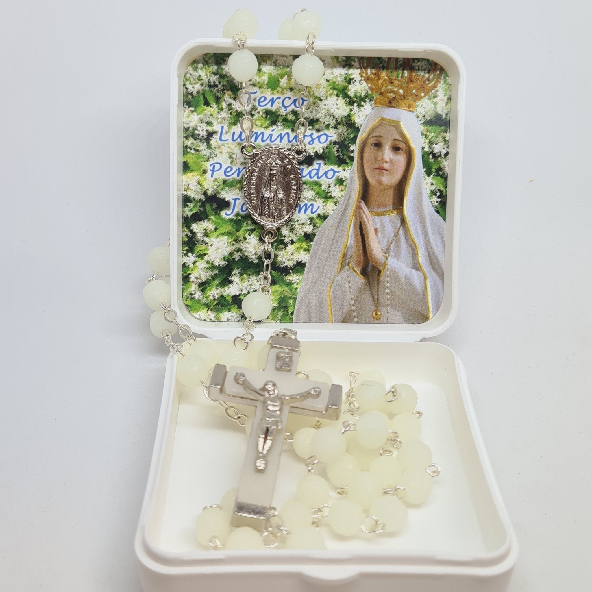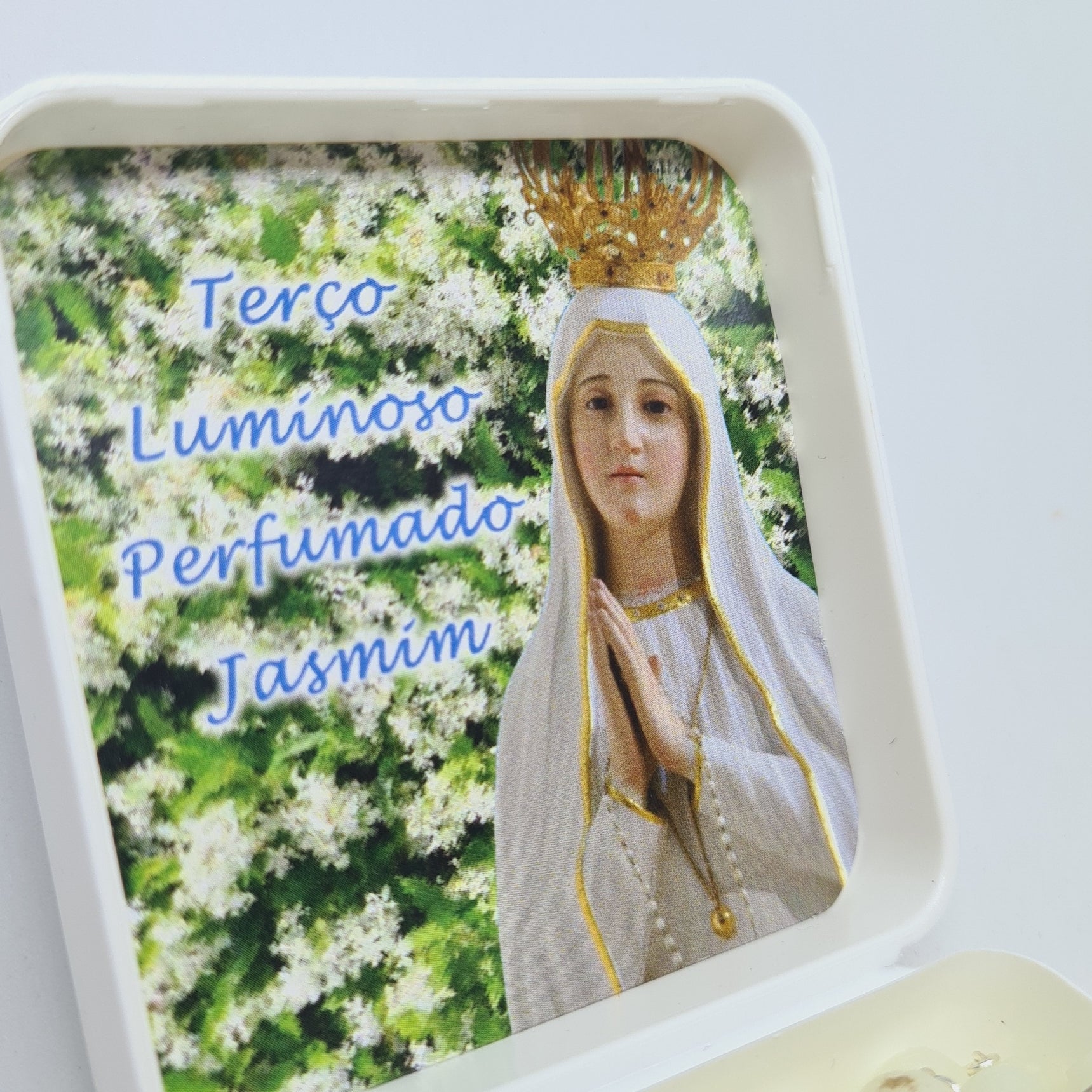 The luminous rosary glows in the dark, featuring a medal of the apparitions of Fatima and a traditional cross, while emanating a magnificent jasmine scent.
