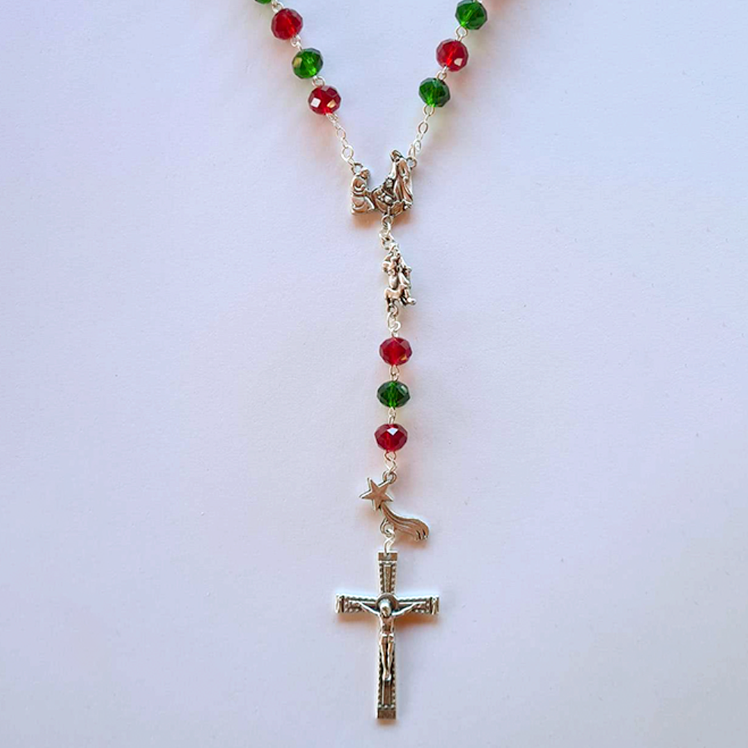 This beautiful rosary is carefully handcrafted from European glass and stained with the emerald green and ruby red colors to reflect the Christmas spirit.