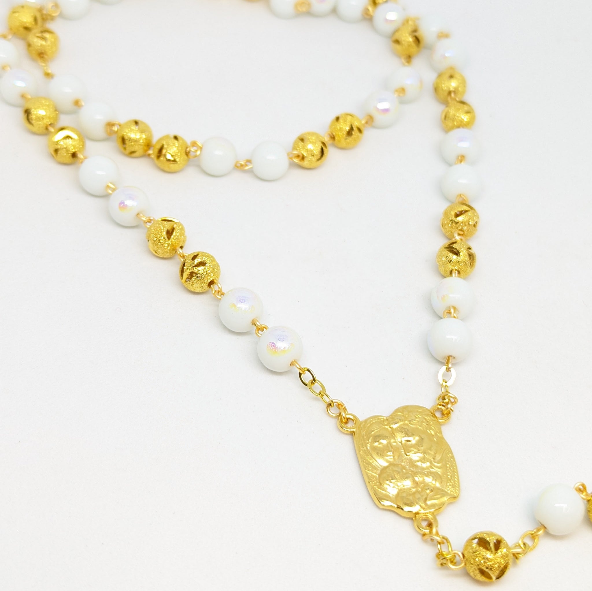 The golden beads are finished with an hand made cutout effect that confers the rosary its extra glimmer look.
