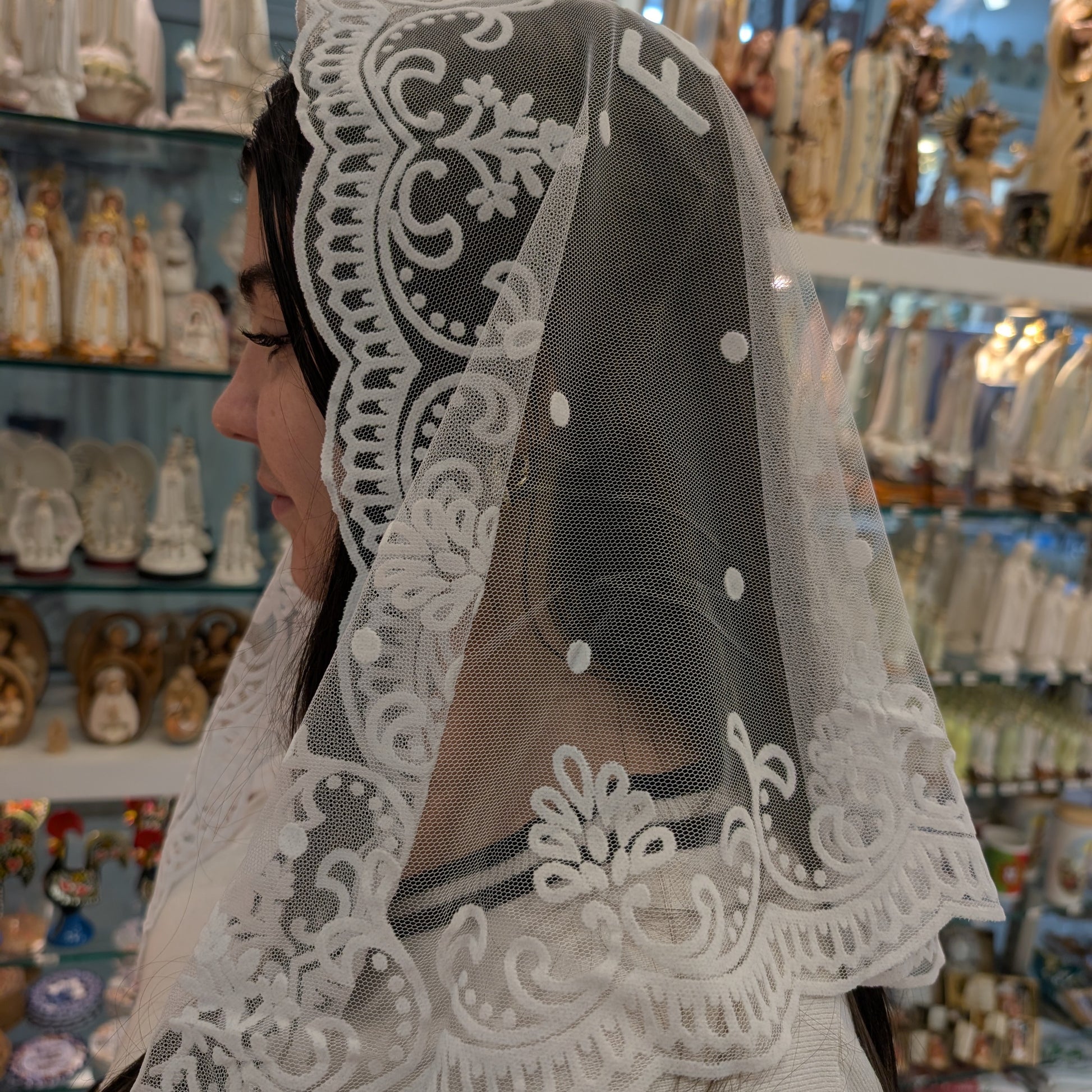 El Velo (Mantilla) de Nuestra Señora de Fátima es el símbolo perfecto de reverencia y devoción para toda mujer católica. Este velo delicado y ligero está confeccionado con encaje fino o tela ligera y está adornado con elegantes detalles bordados. El diseño presenta de manera prominente la palabra "FÁTIMA" y una sutil y hermosa Imagen de Nuestra Señora de Fátima. Disponible en tres colores clásicos —Blanco, Negro y Gris— este velo sirve como una hermosa expresión de fe y modestia, conectando a quien lo lleva con la gracia sagrada del santuario de Fátima.